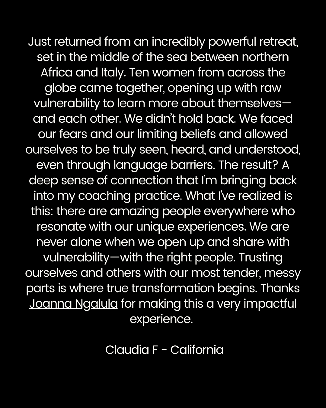 Our September retreat in Sicily was one filled with love, discovery, and transformative moments. Participants experienced deep rest and the gentle release of past burdens, creating space for new beginnings. Held in a safe and nurturing environment, we gathered under the warm Sicilian sun, allowing our journeys to unfold in a truly unforgettable experience of healing and renewal.
